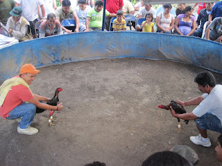 For the event of the festivities, the town had improvised a small cock ring in the backyard of a private house for cock fights, an illegal practice in Bolivia. Not exactly my cup of tea, but for the sake of getting to experience something new, I decided to have a peek and see how such a sport is done, prepared and gambled on. The cocks are prepared by banding a sharp metal pin to the inside of each leg, weighted as the fights are weight-based, and allowed to pick at each other's neck aggressively while its respective owners are holdig them to create animosity and on they go. The fights last a long 40 minutes! By the middle of the 2nd round I had to leave as I wasn't able to stomach the cruelty of the "sport". As suspected, the audience is about 95% men, there were but 2 women in the crowd, I included. It is also interesting to note that the lowest bid is 100$ (yes the bids are in dollars not in Bolivians pesos)! These men are all dressed in simple t-shirt and jeans, some torn and dirty like that of a mechanic... yet shouting sums that are all above the month's minimum wage of Bolivia. It was a sight to behold.